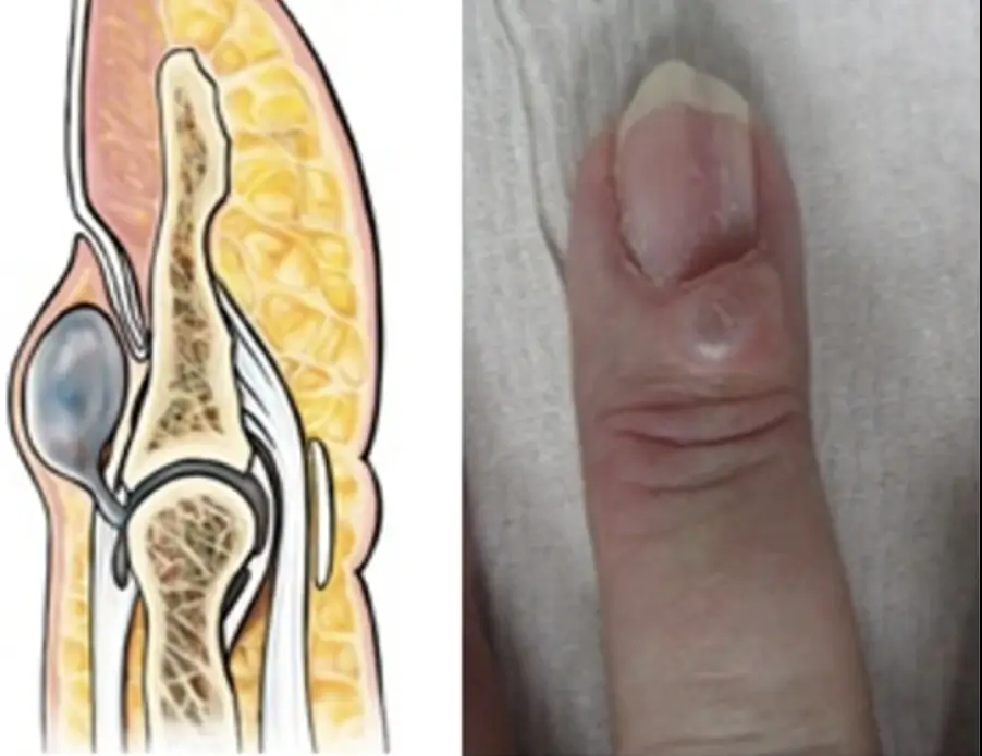 Il s’agit d’une petite tuméfaction bénigne qui siège autour de la dernière articulation du doigt. Elle est parfois remplie de liquide clair. D’origine articulaire, ces tumeurs accompagnent les articulations touchées par l’arthrose. Elles envahissent la fine peau qui les recouvre et peuvent se rompre spontanément (fistulisation) ou s’infecter, entraînant alors une infection de l’articulation (arthrite ou ostéoarthrite). Lorsqu’elles compriment la matrice de l’ongle, elles peuvent entraîner une déformation de l’ongle qui peut être définitive.