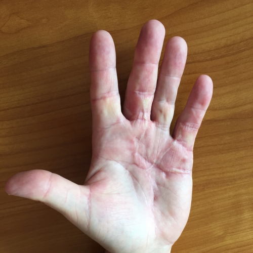 - apparition de nodule dans la paume de la main, la face palmaire des doigts ou la face dorsale des articulations IPP IPD